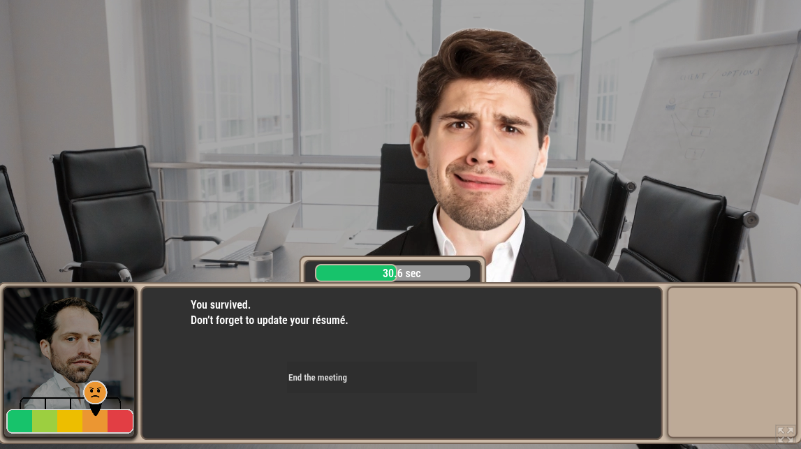 Thanks for playing, really glad you found it funny! We were going for that "realistic but still unorthodox cartoony vibe". Big heads just felt right to mix with absurd office dialogue and corporate environment. Thought about using our faces... Nicolas Cage style, and narration (voice acting is great idea btw) but unfortunately there was no time to add all that. But hey, you never know what the future holds :)