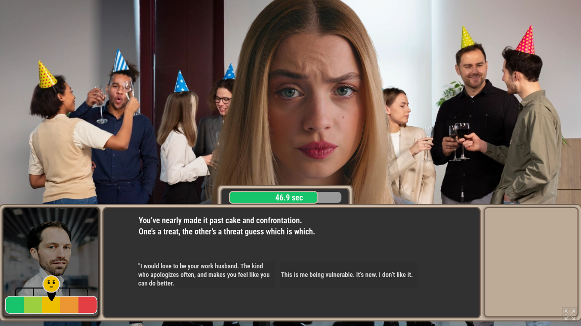 Controls: Mouse click to choose dialogue, Press F of left mouse click as fast as possible to get through stress.