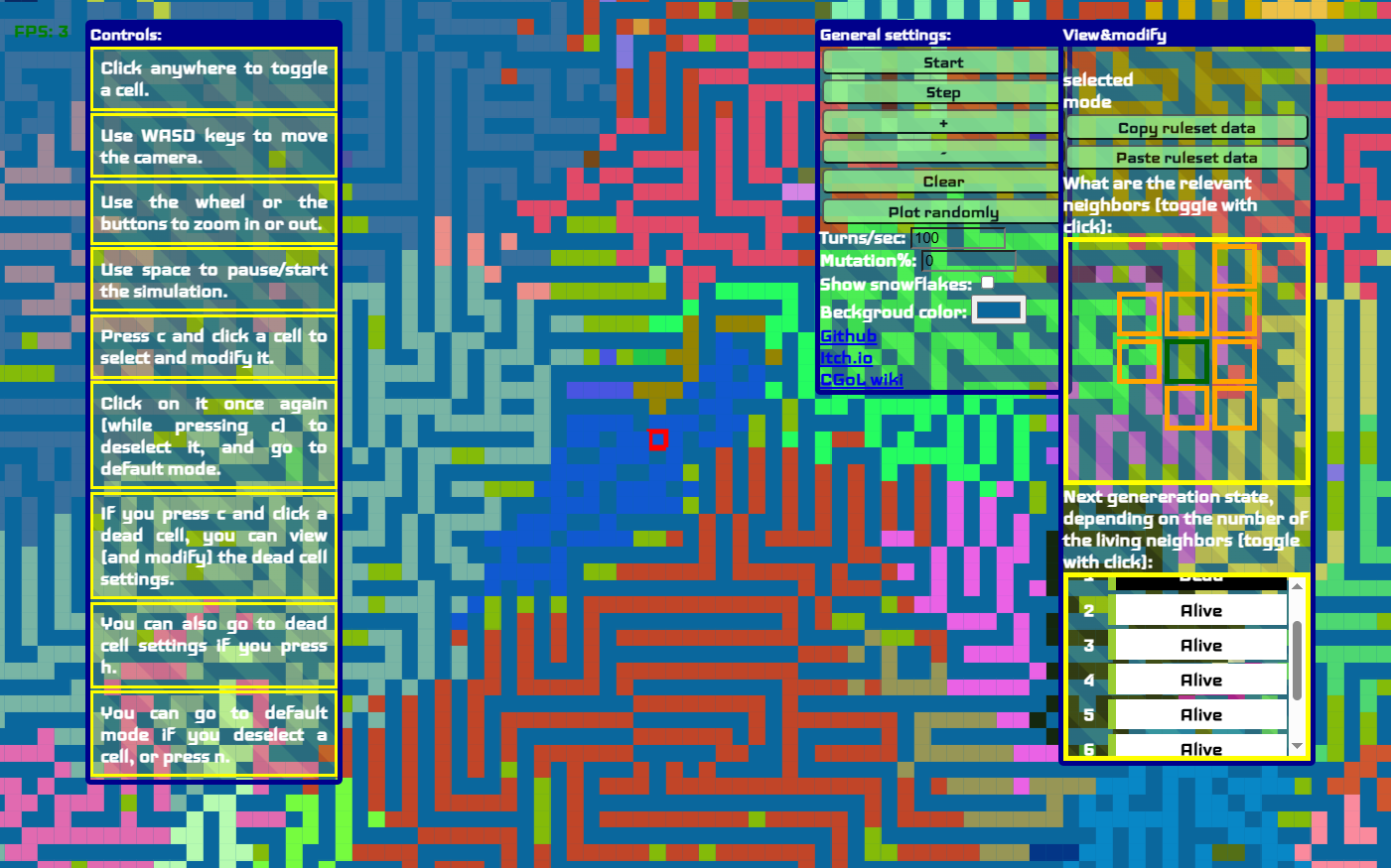 It is always fun to play around with cellular automata. especially when there is an UI to mess around with the parameters :-) It took me some time to wrap my head around the cell selection and different rulesets principles though, and I wished I understood it before resetting the page for the first time because I found a nice combination that made ever 2x2 square shoot a vertebra-like column that periodically collapsed and now I cannot find the settings for it again...