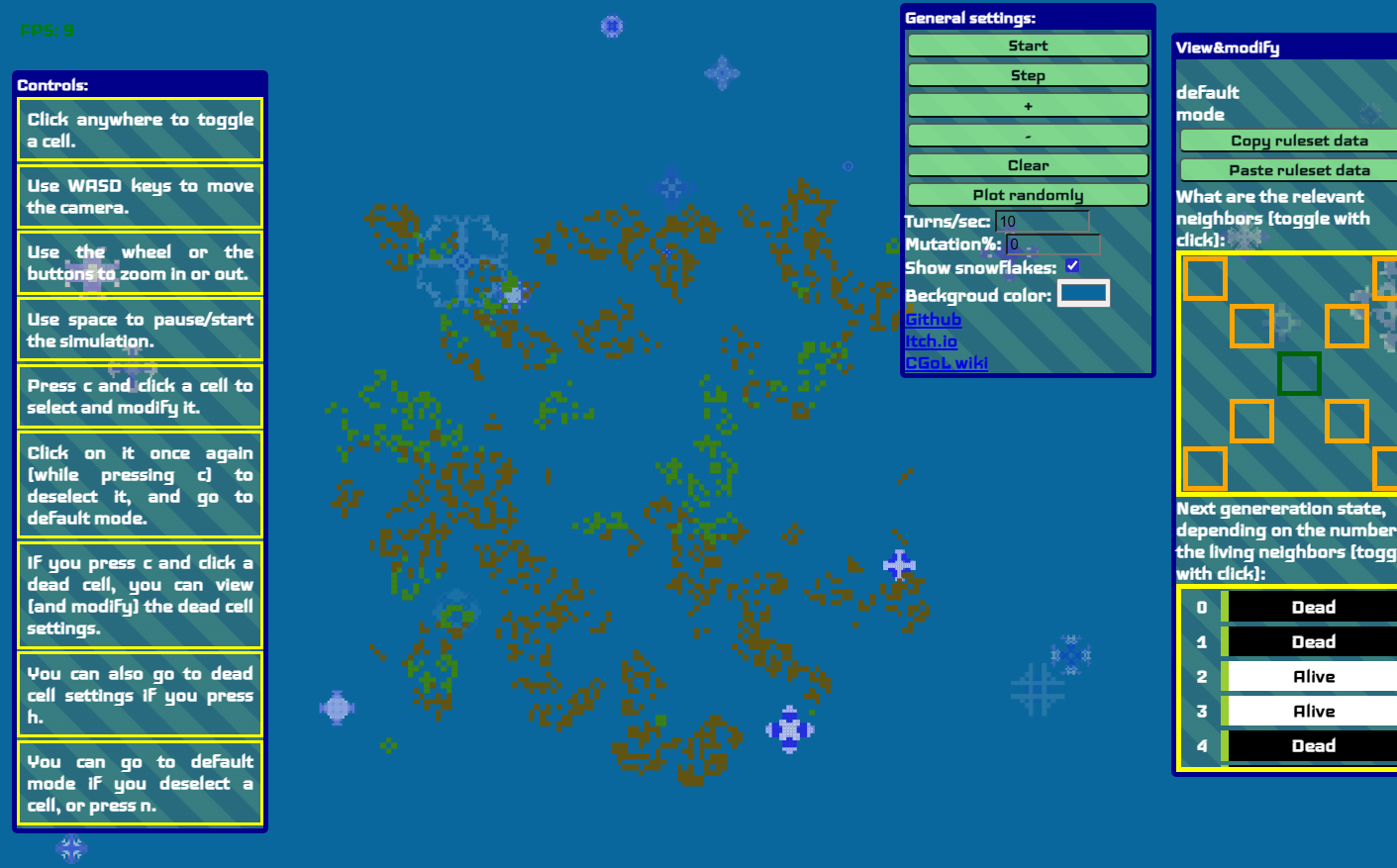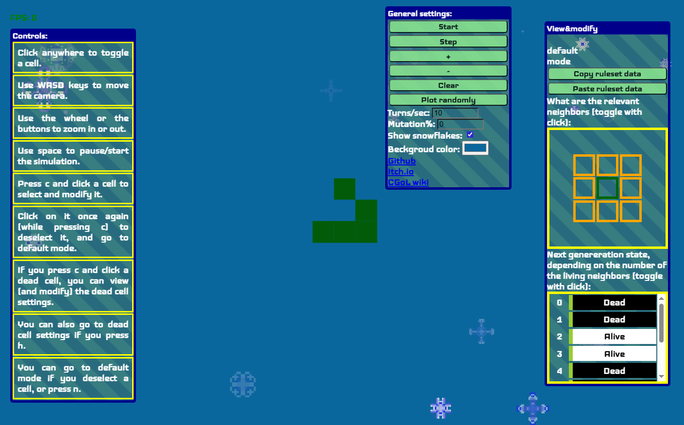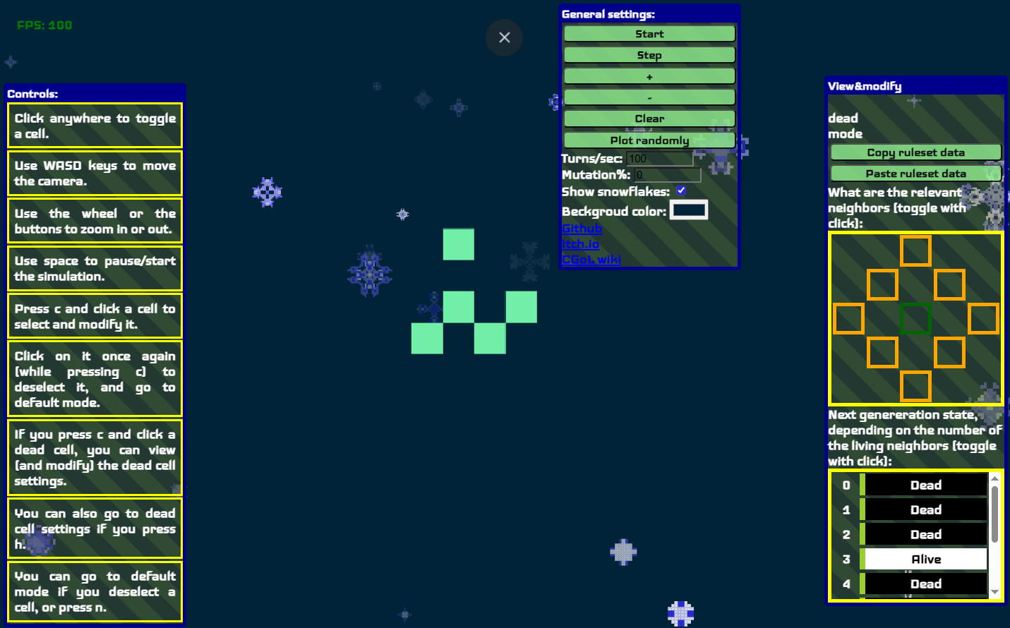 Also, while I think the were a bit too distracting for playing around with the cellular automaton part, I did like how the snowflakes looked, especially since they seem to be generated from within the tool itself :-o Maybe I just missed it, but is there a way to access the ruleset(s) use to generate those?