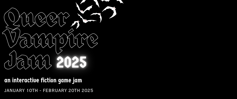 This is a month-long game jam that will run from January 10 - February 20th, 2025. The goal of this jam is to create more interactive fiction games about queer vampires, focusing both on queer relationships and queer experiences as told through a vampiric narrative.