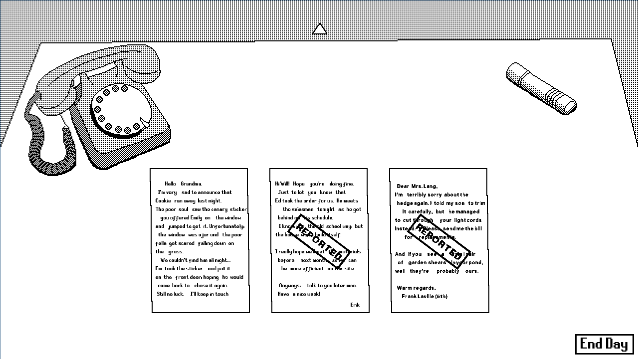 Really great game, reminded me a lot of Papers Please. The art style is truly outstanding. I have to admit that searching through the letters got a bit boring for me towards the end. But that might be because I'm not a native speaker, which made it a bit more difficult for me. Great Job!