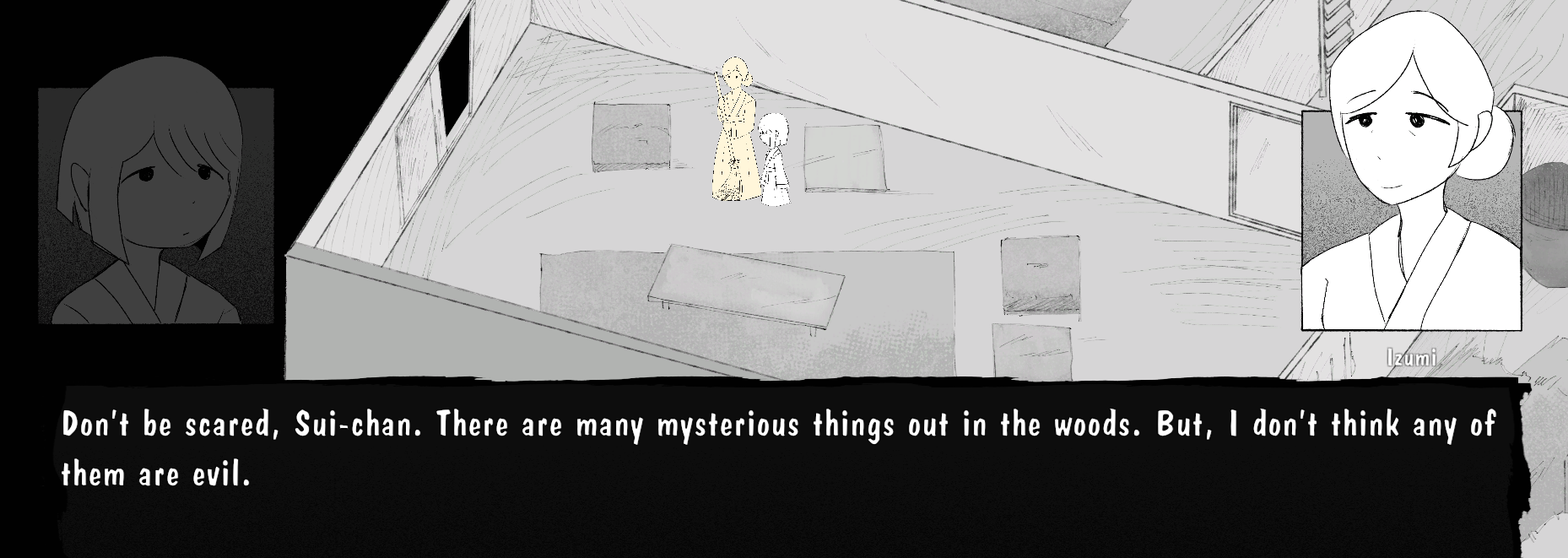 Yes, the story is very much routed in traditional folklore. Sadly, we had to cut some content and it was originally thought that there were more nights and the story would progress every night when fetching the water from the well. It would then evolve around how the water changes Izumi and how Suiko tries to safe her sister, but actually hurting her by giving her the water. So thematically, it would be very much rooted in japanese folklore and be equally scary and tragic.