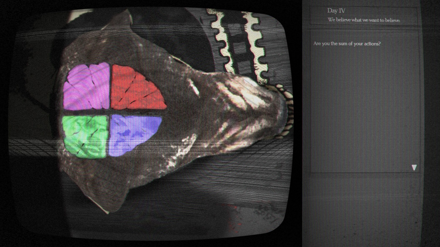 About the pin-dice and static effects: the idea was that you are visually seeing the perspective of the parasite, who can only intercept the electric impulses of the wolf’s brain. The pins represent it interfering with the brain’s functionality to affect the wolf’s reasoning. We ended up writing the text from the wolf’s perspective instead of the parasite as that turned out more engaging, but I hope it didn’t muddy the idea too much.