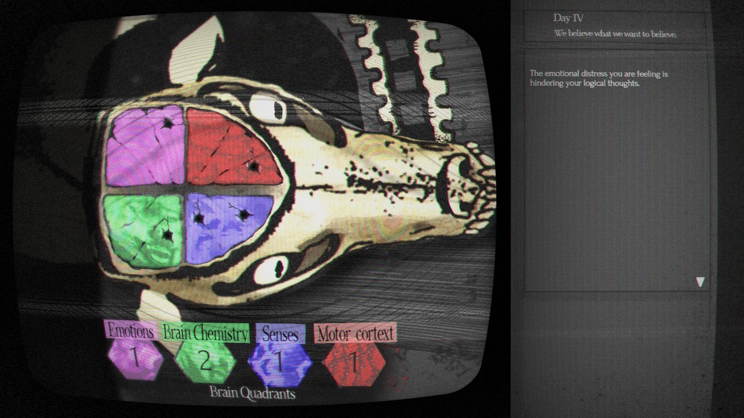 super interesting way of implementing narrative choices! i liked how "upgrading" your stats means more holes in the brain that you can use rather than a direct numerical upgrade; i wonder if being able to choose between that and the standard stat increase would be an interesting thing to play with. i think just a little more initial clarity with the tutorial would help, and as someone else already mentioned it'd be nice if all your choices progressed or punished you instead of being stuck in a "loop" until you select the right option.