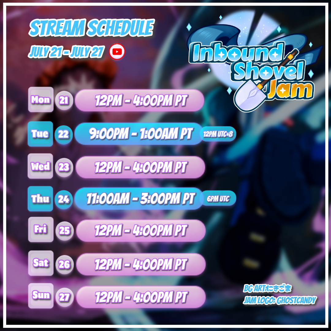 Submitting a game to the jam is granting permission for that game to be featured in an InboundShovel Youtube video, as well as streamed live!