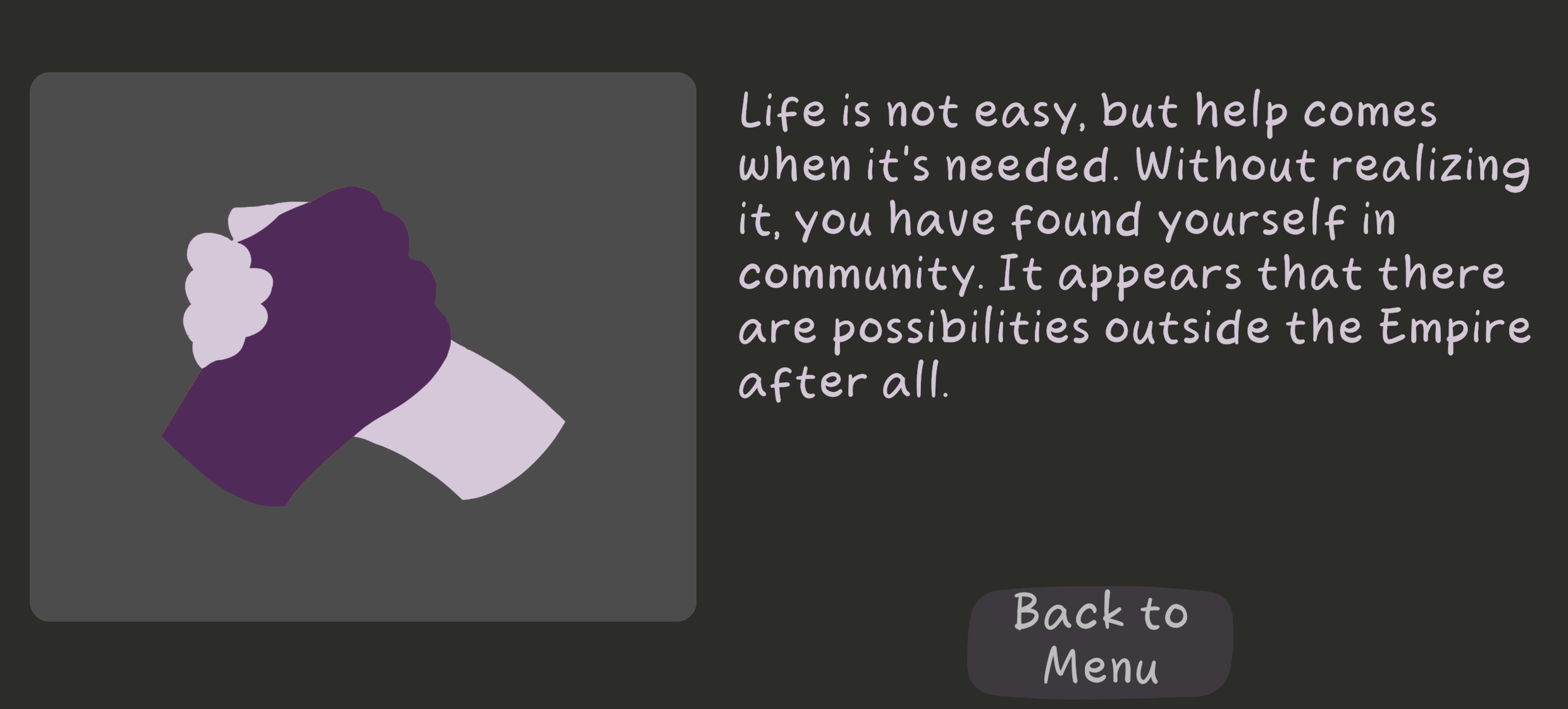 This is such a cute take on the theme! I love the humour in the writing ! The art style was also really cute but made it a little hard for me to discern the UI elements. Overall great job!!