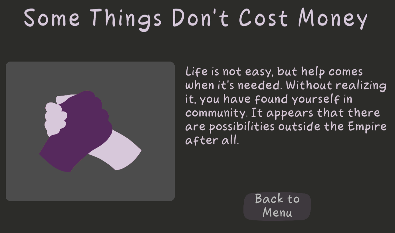 Lmaooo ahahaha, I guess I will give everything for free to the needy atp xD I played it twice to see if i get a different ending. It said that I finished my quota for the day even though I dint.