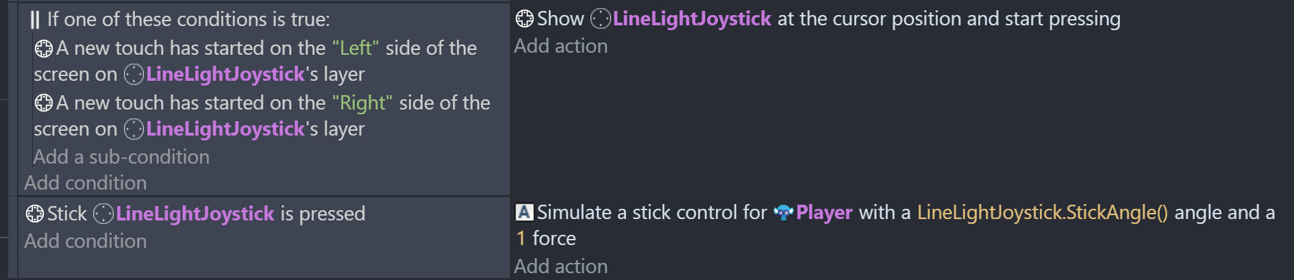 Once you have the virtual Joystick on the scene go to a condition and click on the Joystick object.