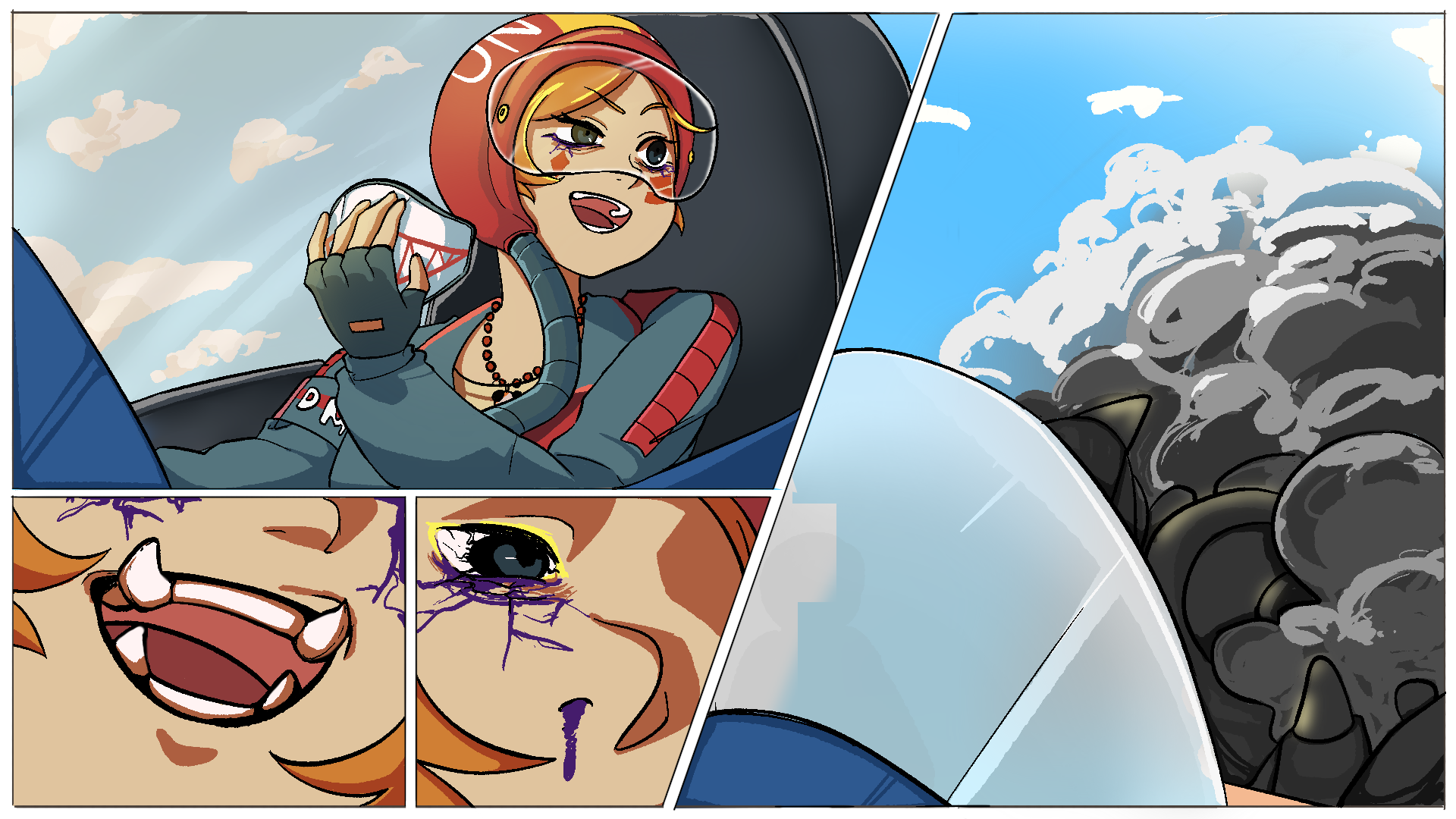 The right panel is even more confusing. I can't tell which side of the jet plane it is showing and .... wait wait, does something happen to her there?