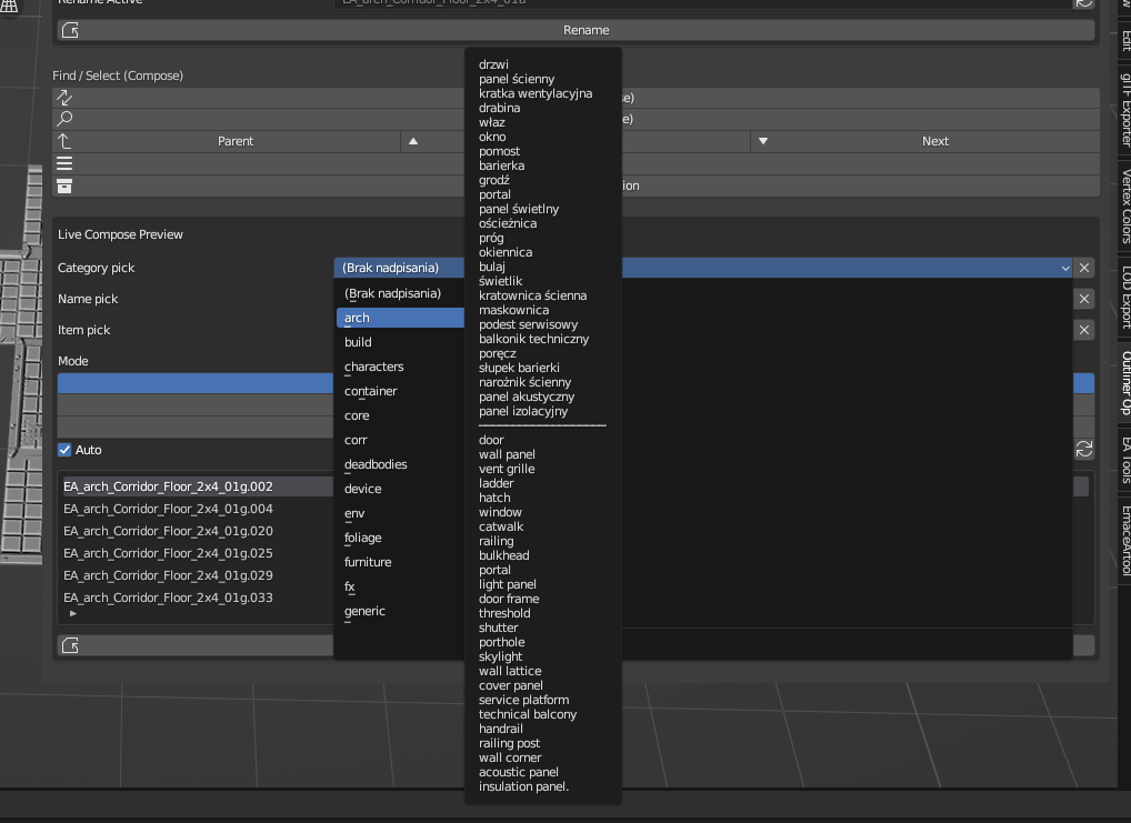It’s good that we can wrap all of this into a single “send” click ;) The real nightmare that remained was naming models! But even that is handled by an Outliner add-on I wrote with some AI help – it searches the scene for all objects that share the same name core, which tend to appear accidentally during fast work, and lets you batch-fix / unify the names so the prefab, LOD and the rest talk to each other the way they should. On top of that, with a simple picker I can immediately assign a category (e.g. object type), which gets appended to name and item, so the whole pack stays organised without manually clicking through hundreds of objects. I’m attaching a screenshot that shows it, and in the near future I want to describe it properly on my blog.