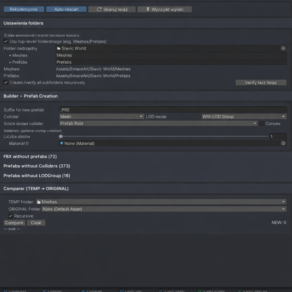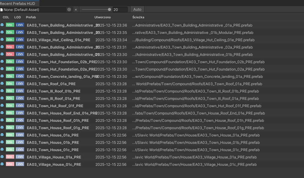 On the Unity side we’ve got a tool we built together (EmaceArTool) that automates the second half of the job: it creates prefabs, generates LODs and has this little “hygiene inspector” that checks the last ~50 used assets to see if they have LODs and colliders. If something is missing, you can add collisions to any number of prefabs with a single click, even attach LODs, all without opening them one by one. Thanks to that, the boring technical part is handled by the computer, and we can pour our time into a massive, dense asset pack and into how everything looks in the frame