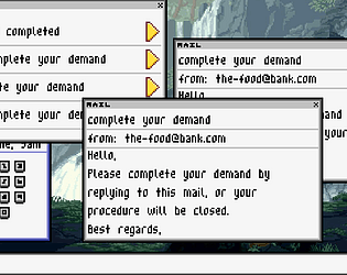 The background image is really amazing, unfortunately I don't have such talent so here is the artist page : https://wallpapercave.com/w/wp4694498 (they have amazing work to check out). This link is also present in the general "credits" page (https://pastebin.com/raw/cKpvdVN2). The only assets I've made are the "windows" and buttons.