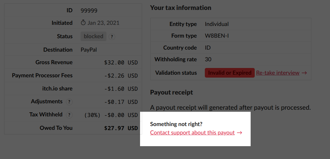 If your tax information is outdated or invalid, a large banner will now be across your Dashboard’s payout page, informing you with a direct link to retake the tax interview. You no longer have to visit a separate page to verify that your tax information is valid when checking on the status of your payout. Additionally, we’ve made some backend changes to synchronize your account’s tax status more actively from our third-party tax verification platform.