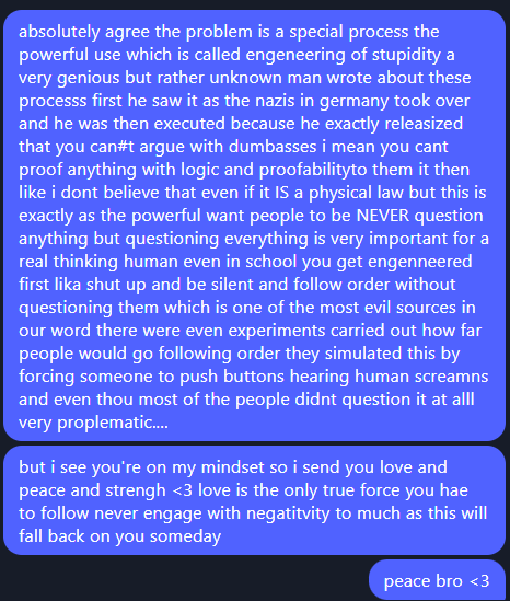anyway NEVER FOLLOW ANY ORDERS WITHOUT QUESTIONING THEM......be sceptical thats the only thing keeping you from becoming like the masses of ....dumbasses :D