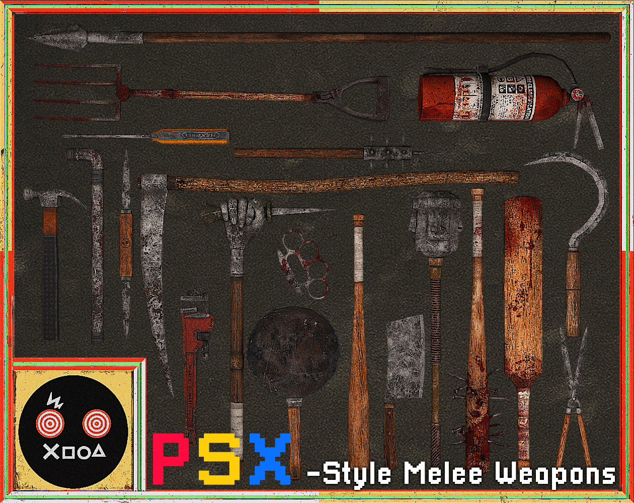 Includes tools, farming tools, knives, fire extinguishers, and unique close-combat weapons.