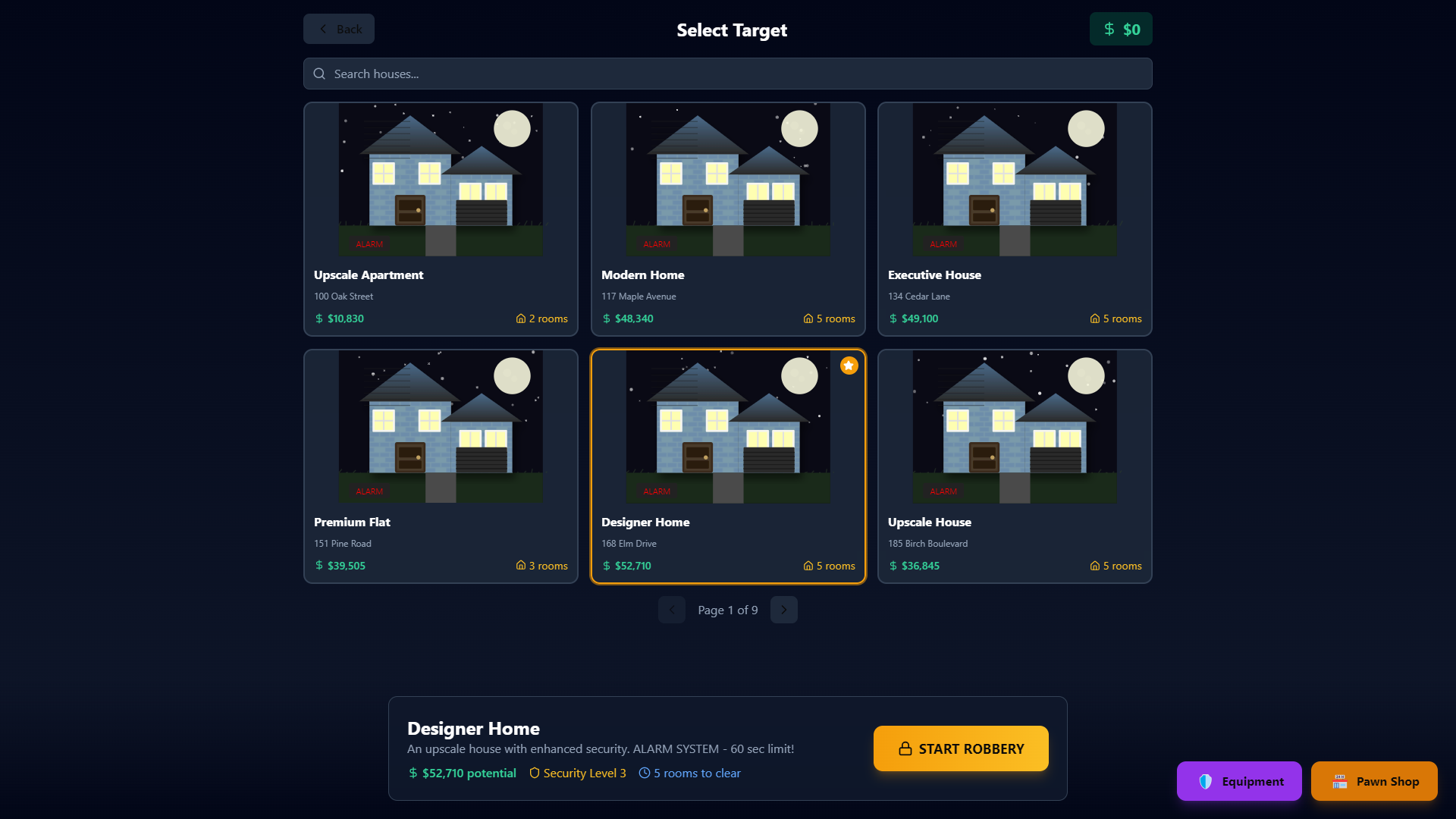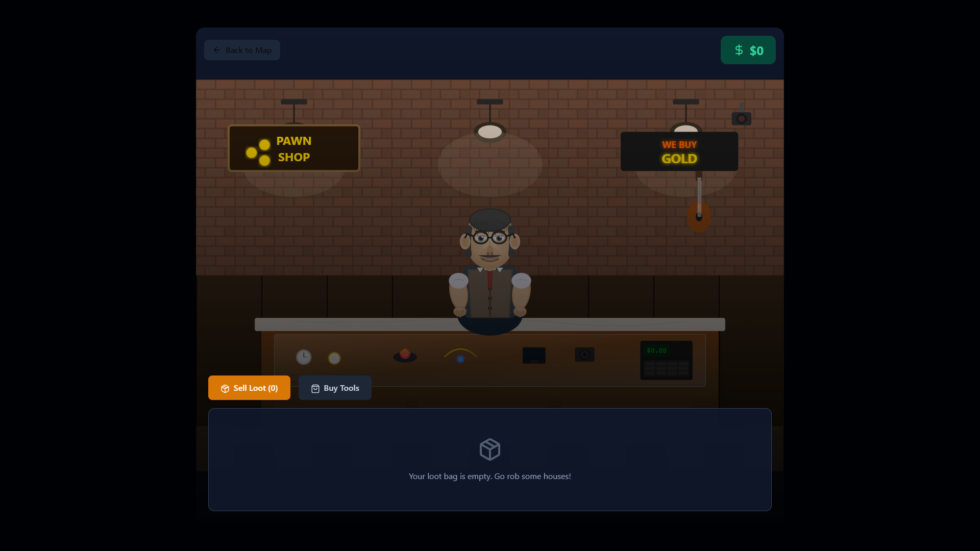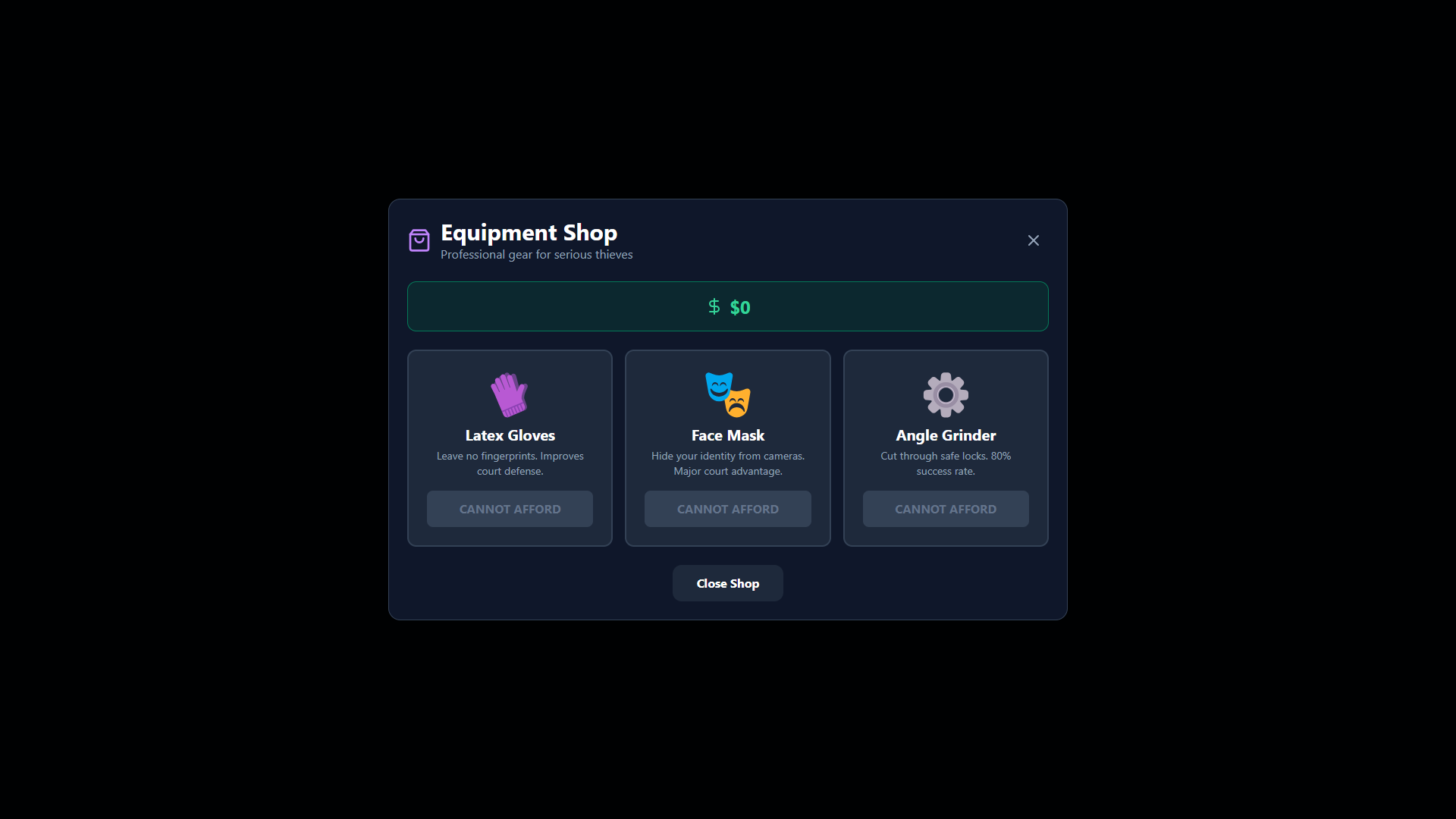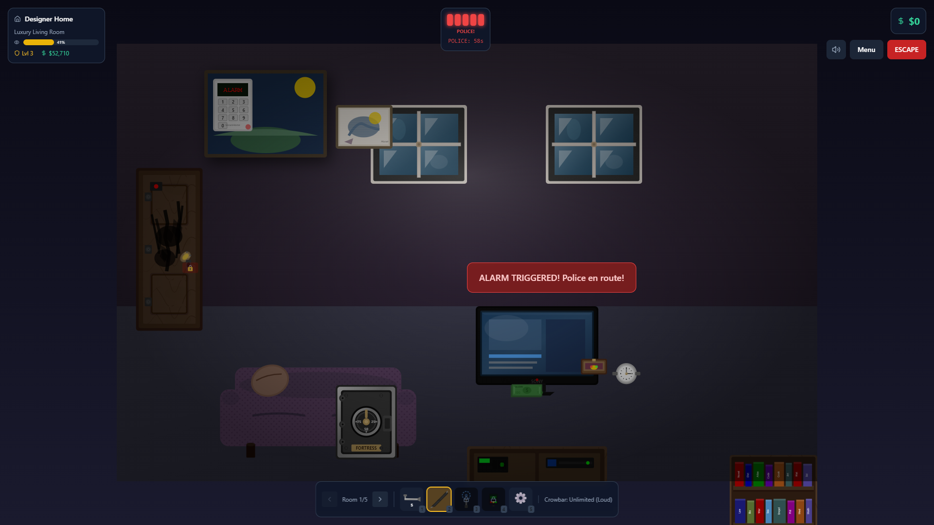 Players start with basic tools and must carefully manage their resources to upgrade their equipment and tackle more challenging targets. Success in robberies provides money to purchase better tools, equipment, and access to higher-value targets.