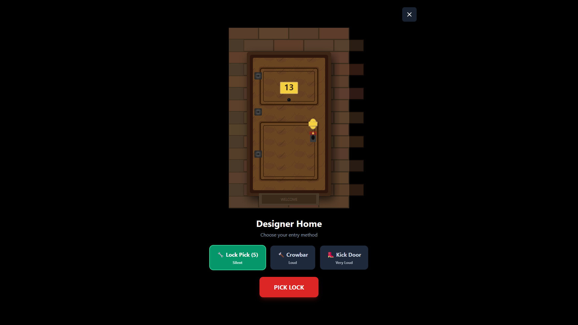 - Door Break-in: Choose between lockpicking (silent), crowbar (noisy), or kicking (very loud)